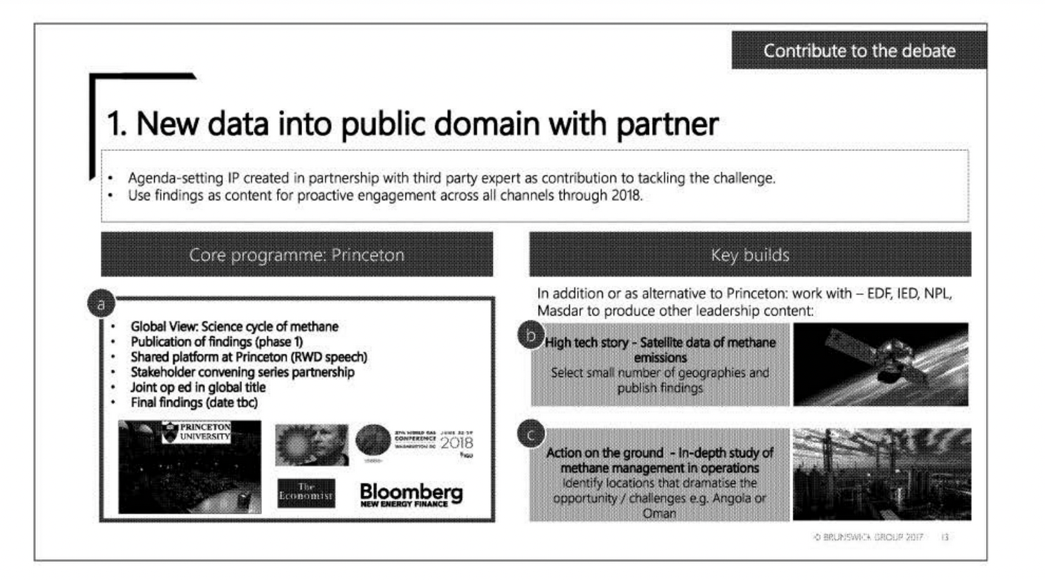 But contributing to the debate doesn't end with funding new university research that backs up their opinion, Brunswick suggests that BP also consider partnering up with Environmental Defense Fund or science and tech organizations on a "high tech story" focused on satellites gathering data on methane emissions and on "action on the ground" messaging about how the industry is managing methane emissions. It's hard to avoid thinking about that slide amidst discussions of the U.S. EPA's new methane rule and how satellite monitoring will or won't help to enforce it. The underlying message here is that if you can make it look like you're doing something about the problem—by studying it and monitoring it—that's generally enough to convince people that you're actually doing something about the problem, which has historically been enough to keep regulation at bay.