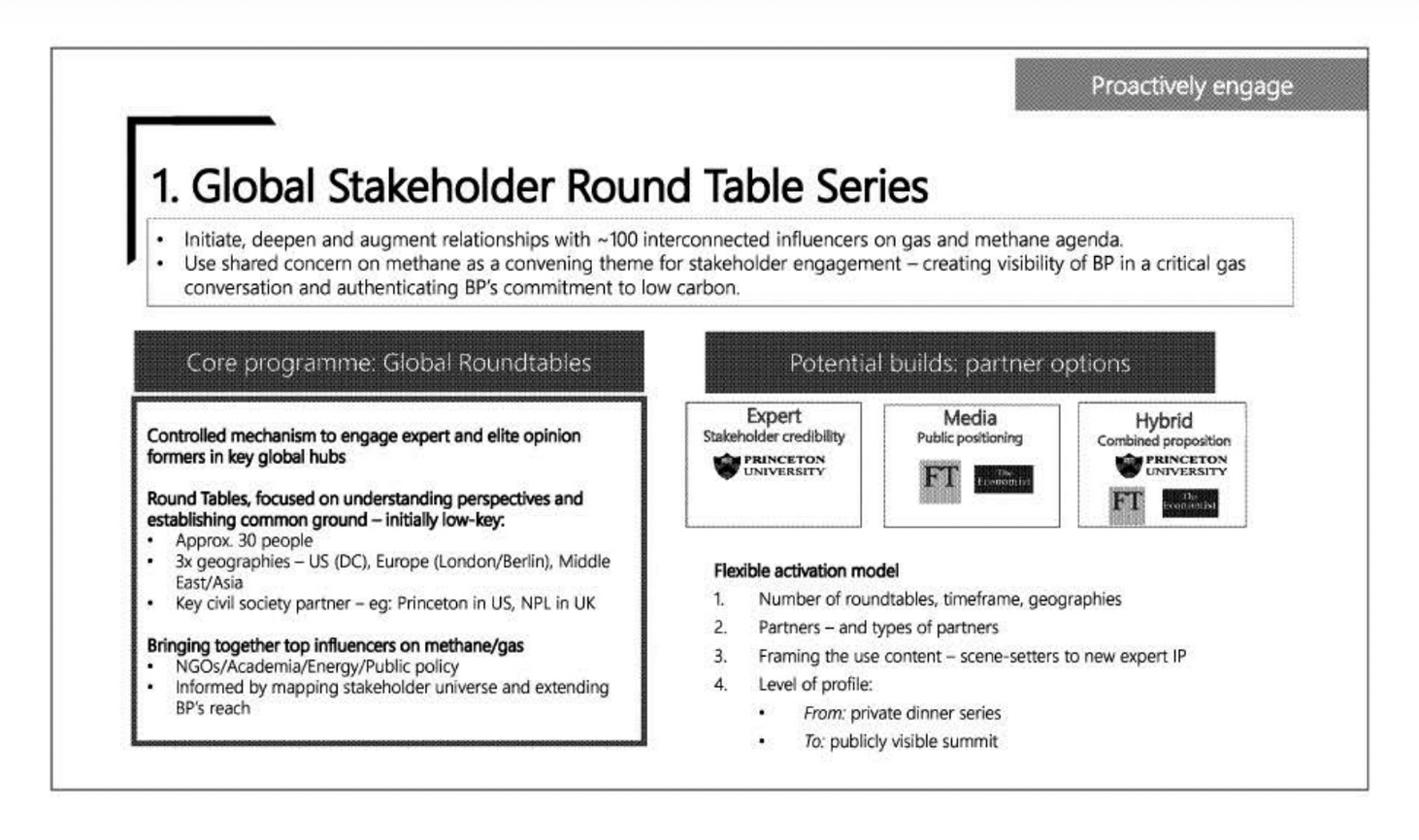Finally, Brunswick gets to the solution, its strategy for warping information and perspectives on gas in BP's favor. First, continue to emphasize the carbon benefits of gas by talking about the transition from coal to gas (never mind that, increasingly, gas is replacing...other gas, not coal). Then, position gas as a partner, not a competitor, to renewables (although from an infrastructure perspective they are almost always in competition). And finally, take a leading role on reducing methane emissions (but, crucially, do so while continuing to focus attention on carbon--because of course if methane is your problem, you want everyone focused on CO2). But how will BP accomplish these goals? Brunswick suggests the company "contribute to the debate," and key to that endeavor is the need for "new data into public domain with partner." Which partner(s), pray tell? Well, Princeton University of course, where BP has long funded the Carbon Mitigation Initiative and where, as Molly pointed out in her piece this week, the company has a "synergistic" relationship with researchers.