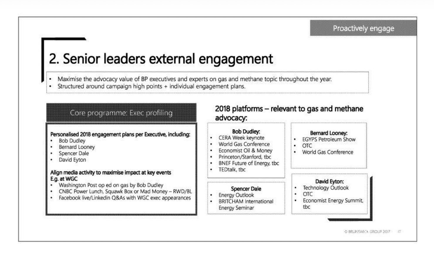 Once you've got new information to share, the next step is to get it out to the masses, and here again Brunswick suggests that BP lean on its relationship with Princeton, recommending round tables and events with Princeton alone and with Princeton alongside a preferred media partner, like the Financial Times. It also recommends a circuit of conference and speaking engagements for top executives, with corresponding top-tier media hits, for example a Washington Post op-ed, CNBC Power Lunch, and Facebook Live Q&A that all coincide with an exec speaking at a major energy conference.
