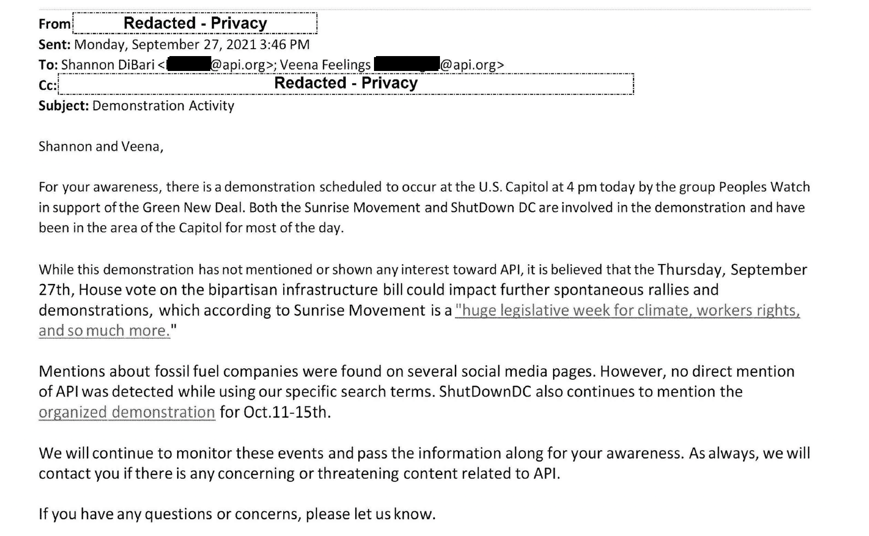 Underpinning all of this, of course, is also a robust corporate surveillance strategy that helps both the the oil company's execs and those at its PR firm keep on top of what activists, journalists, and others are saying about gas and respond instantly. We know this from the recent documents, too. In a September 2021 alert sent to the American Petroleum Institute, the largest U.S. trade group for the fossil fuel industry, a surveillance company called Command CG notes: "there is a demonstration scheduled to occur at the U.S. Capitol at 4 pm today by the group Peoples Watch in support of the Green New Deal. Both the Sunrise Movement and ShutDown DC are involved in the demonstration and have been in the area of the Capitol for most of the day."
