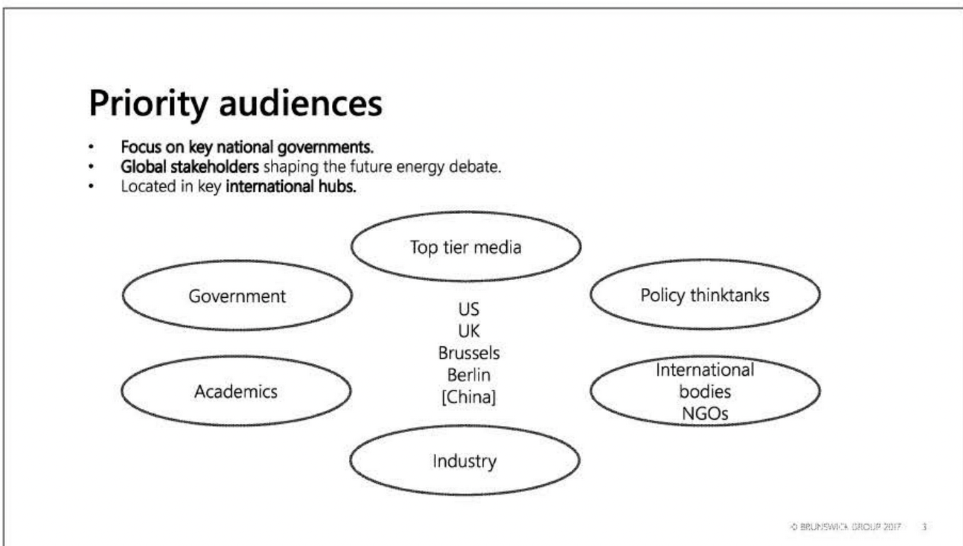 There's one document I keep thinking about, a 2017 strategy that the global PR firm Brunswick came up with for BP. It was actually published back in 2022 with the first round of documents from the House Oversight Dems/Senate Budget Committee investigation into fossil fuel disinformation, but removed from public as soon as Republicans took over the House. [We've preserved those documents here, for the record.] It starts with the goal: "Advance and protect the role of gas — and BP — in the future of energy conversation."